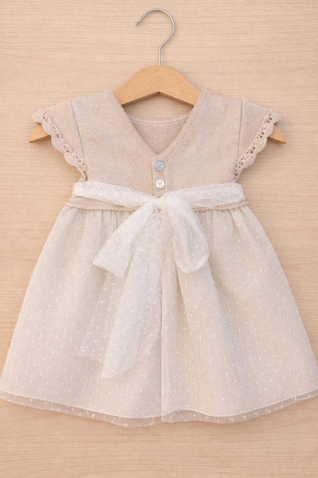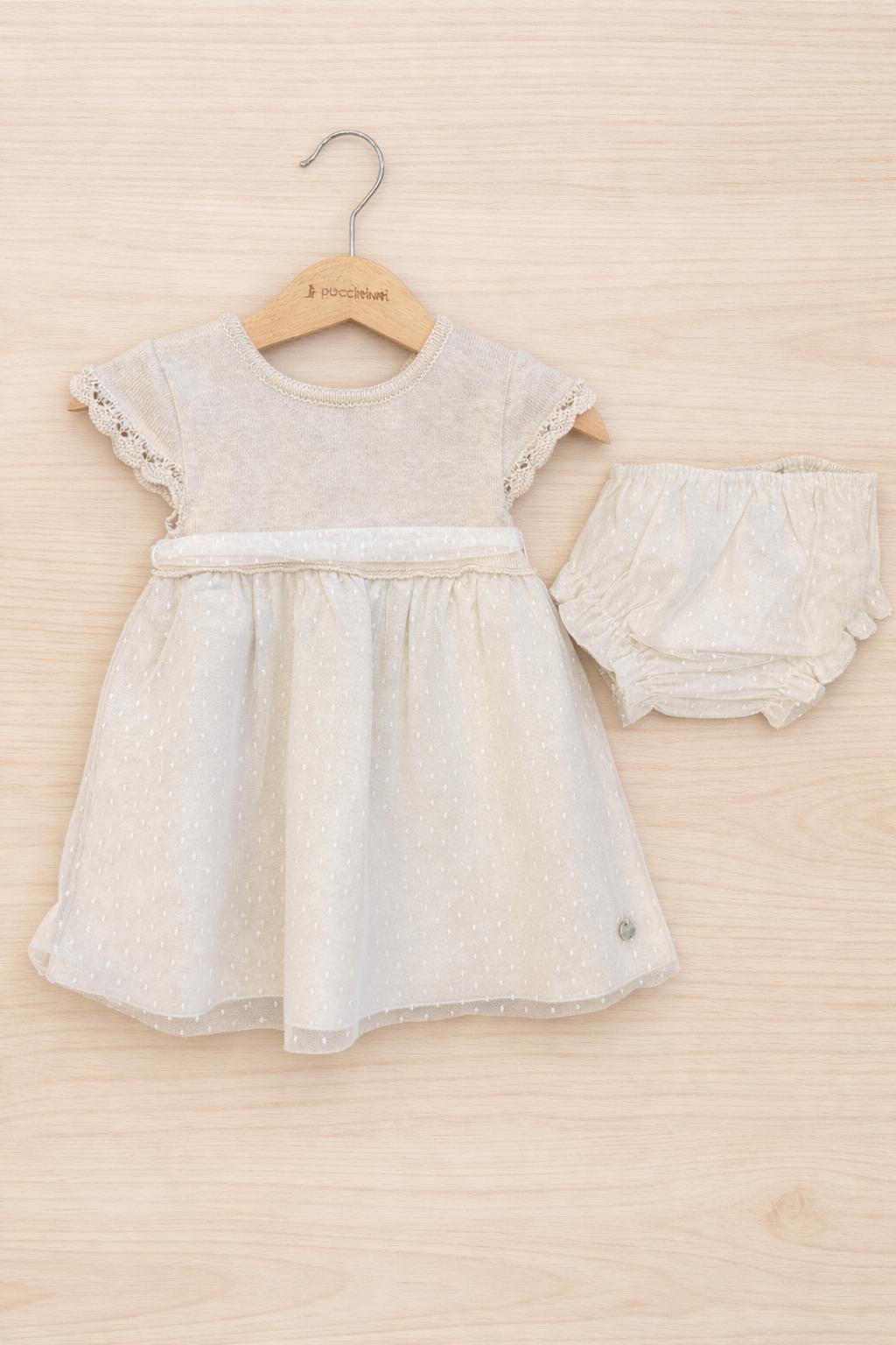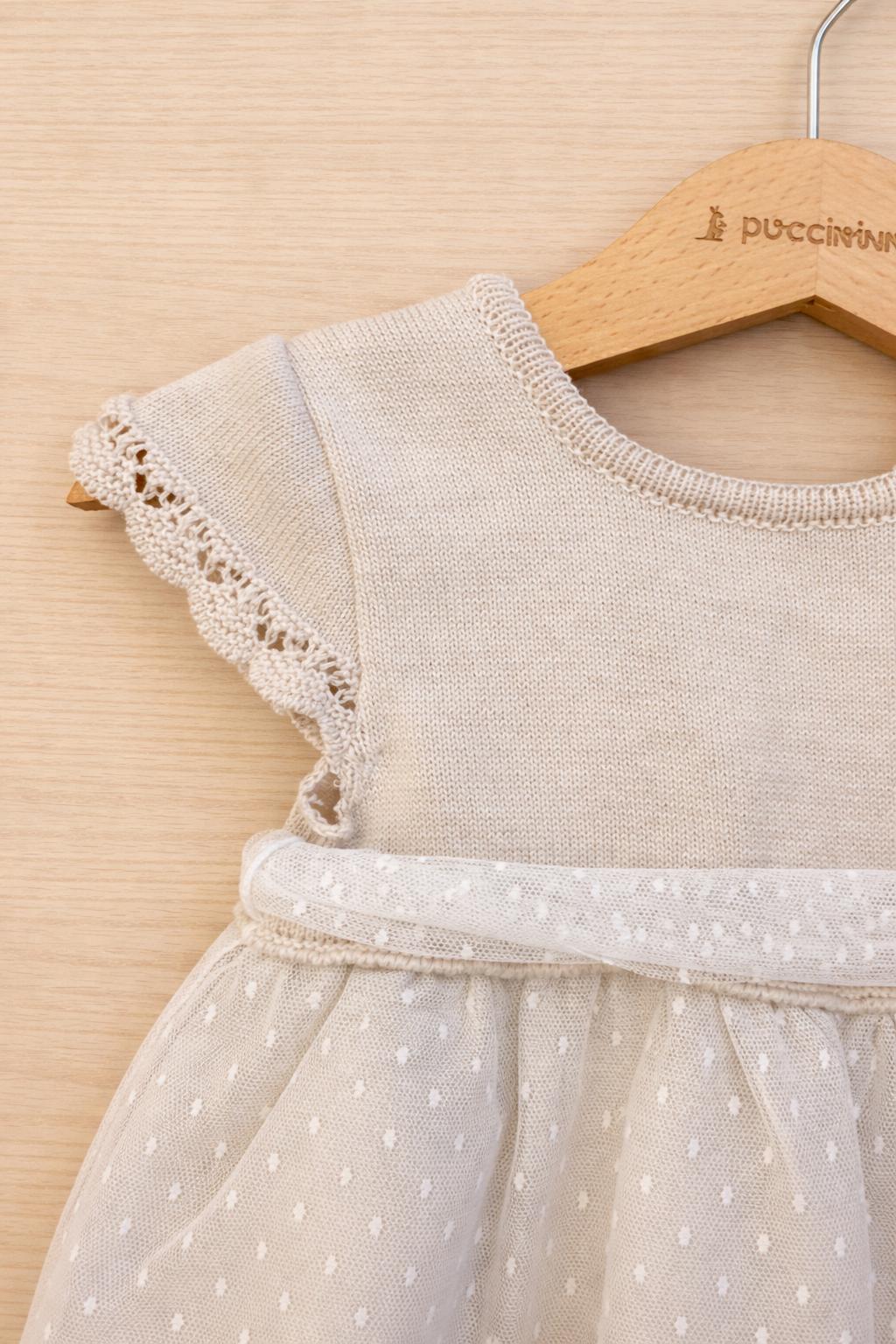 Completo con vestito e culotte. In tulle plumetis con fiocco decorativo e fodera completa, perfetto per cerimonie o eventi eleganti.